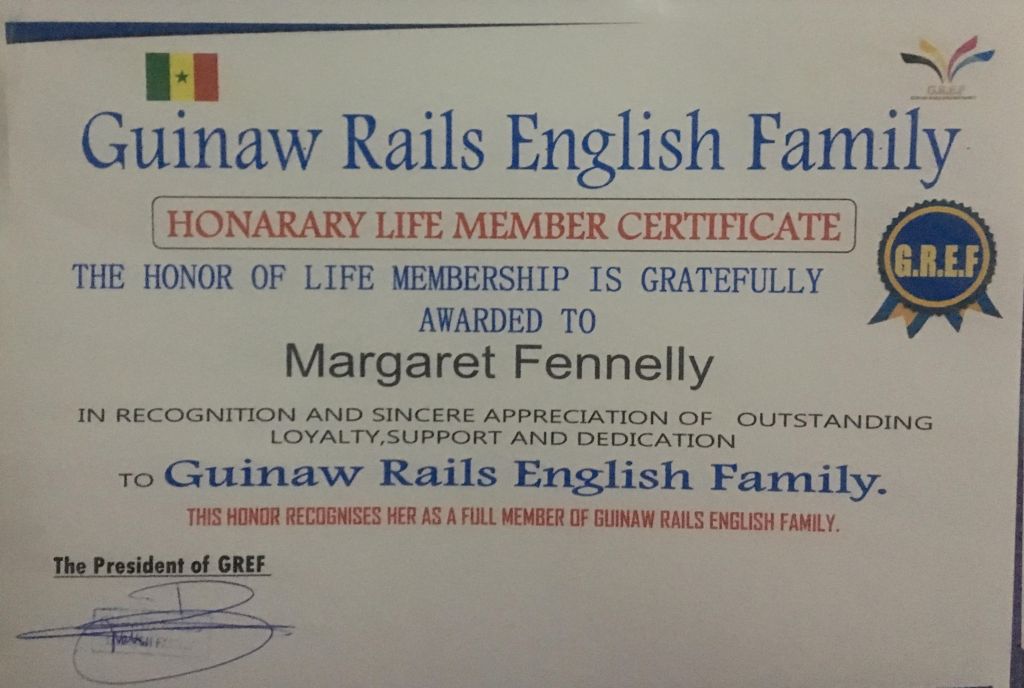 Guinaw Rails English Family Honorary Lifetime membership certificate