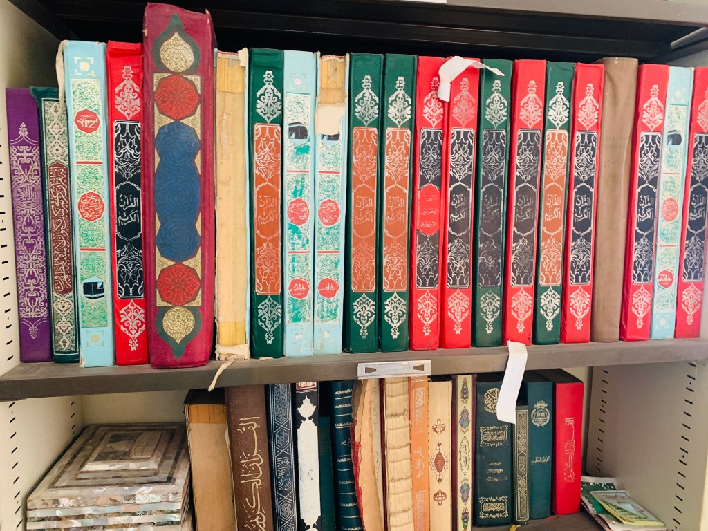 Inside the library we were lucky enough to get a tour from the curator himself. We walked around the different rooms of the library, the first one being a room that contained a lot of writings from Seringe Touba, the man who started the Murids. He had written so many things about a variety of topics and it blew my mind how many books were in this one room of the library. Something I learned while in the library is that all students of the Koran must write the entire Koran from memory in order to finish their schooling. It takes the most dedicated ones about a year and longer for those that learn about other things besides just the Koran, such as Islamic ethics. We were also able to see some of Seringe Touba’s personal belongings however we could not enter the room where they were kept because we did not perform the proper cleansing rituals. It was a really cool to be able to see all of those books and on one of the shelves there was a book gifted my Muhammad Ali. One thing I noted about the books in all of the library was how colorful they all were. In the reading room we were able to see the steps that they are taking to allow people who are illiterate the opportunity to have access to all of this knowledge. But what really confused me is that they have all of this knowledge and access to them is so limited. It was so weird that we were able to have access to all of this and people who are part of this religion might never see it.