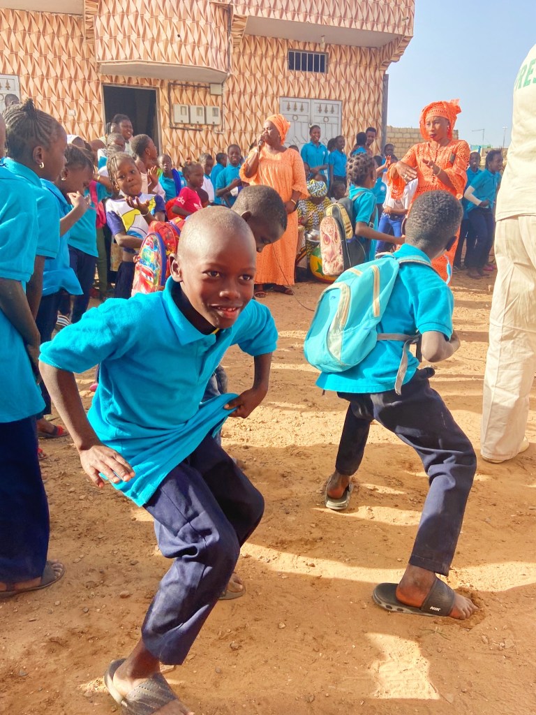 On our last day of doing service in Waranka, the school had a huge party to celebrate our time together. There was loads of dancing, but it was mostly just us toubabs and the teachers. In the corner where I was sitting there were a bunch of very hyper little boys. I had not spent time with them during the week and I think they were very excited to sit with me. They desperately wanted to show off their dance moves and join in with all the adults. The teachers kept telling them to calm down and behave, but these two boys in particular could not help themselves. Everytime the teachers turned away, they were up and dancing for me. I snapped this picture during one of those times. I love the colors and that you can see all the different people at the celebration in the background. There are all the students, trying to keep their excitement in, the teacher trying to keep things under control, the press, and the griots singing.